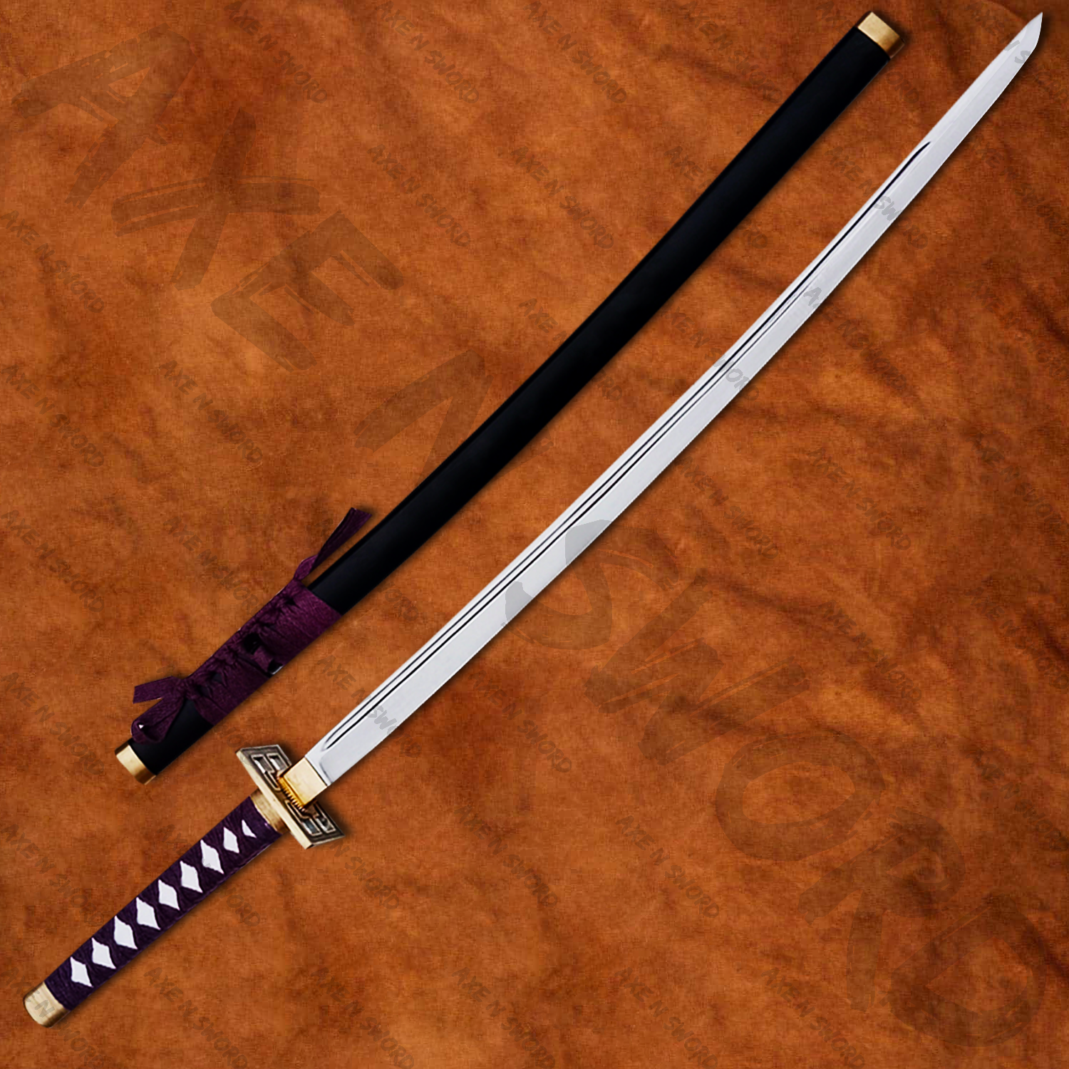Meticulously designed to mirror the distinct aesthetic of Senbonzakura, this full-scale 39-inch katana features a perfectly balanced 30-inch blade paired with a 9-inch handle. Choose between a mirror-polished carbon steel finish or a Damascus steel variant featuring subtle, flowing patterns that echo the fleeting beauty of falling cherry blossoms. The slender blade maintains the clean, refined profile that reflects Byakuya’s serene yet formidable presence. The handle is wrapped in deep purple rayskin, overlaid with soft black cord for a composed and comfortable grip. The signature tsuba (guard) – shaped like a plum blossom – completes the visual with quiet nobility.